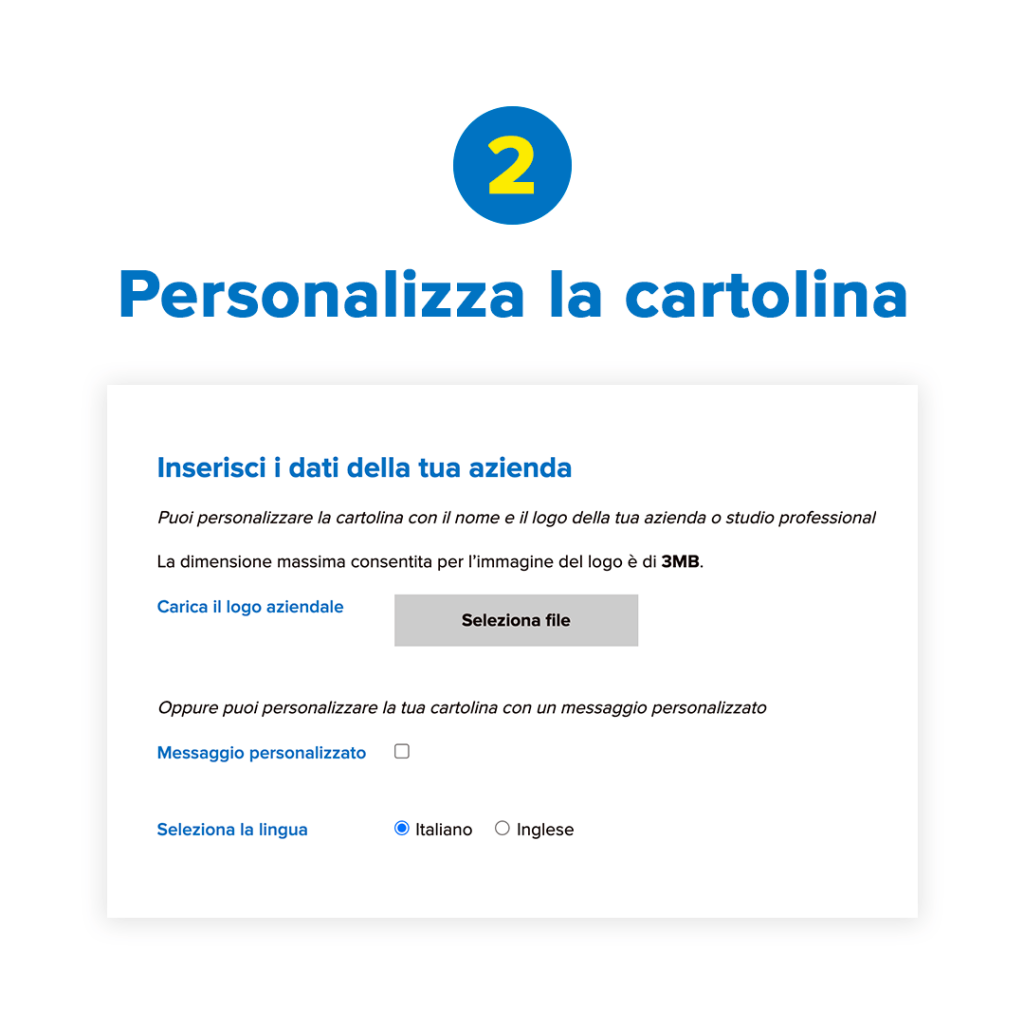 Attraverso una donazione al 100% deducibile, potrai personalizzare la cartolina o la lettera d’auguri digitale con il logo della tua azienda o del tuo studio professionale e condividerla con tutti i tuoi contatti.